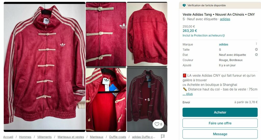 Impossible de passer à côté en 2025 : la veste Adidas CNY / nouvel an chinois est partout sur Insta, Tiktok, Snap… A l’origine introuvable en France, en Europe voire aux USA, il fallait aller sur place en Chine dans une boutique Adidas ou un revendeur. Crées pour hommes et pour femmes, en daim et en jean. Depuis janvier 2026, elle est disponible en France en boutique Adidas à Paris, et donc revendue par des particuliers sur internet. Chez nous, elle est ligne sur LeBonCoin et sur Vinted • Preuves d’achat • Achetés en Chine en décembre 2025